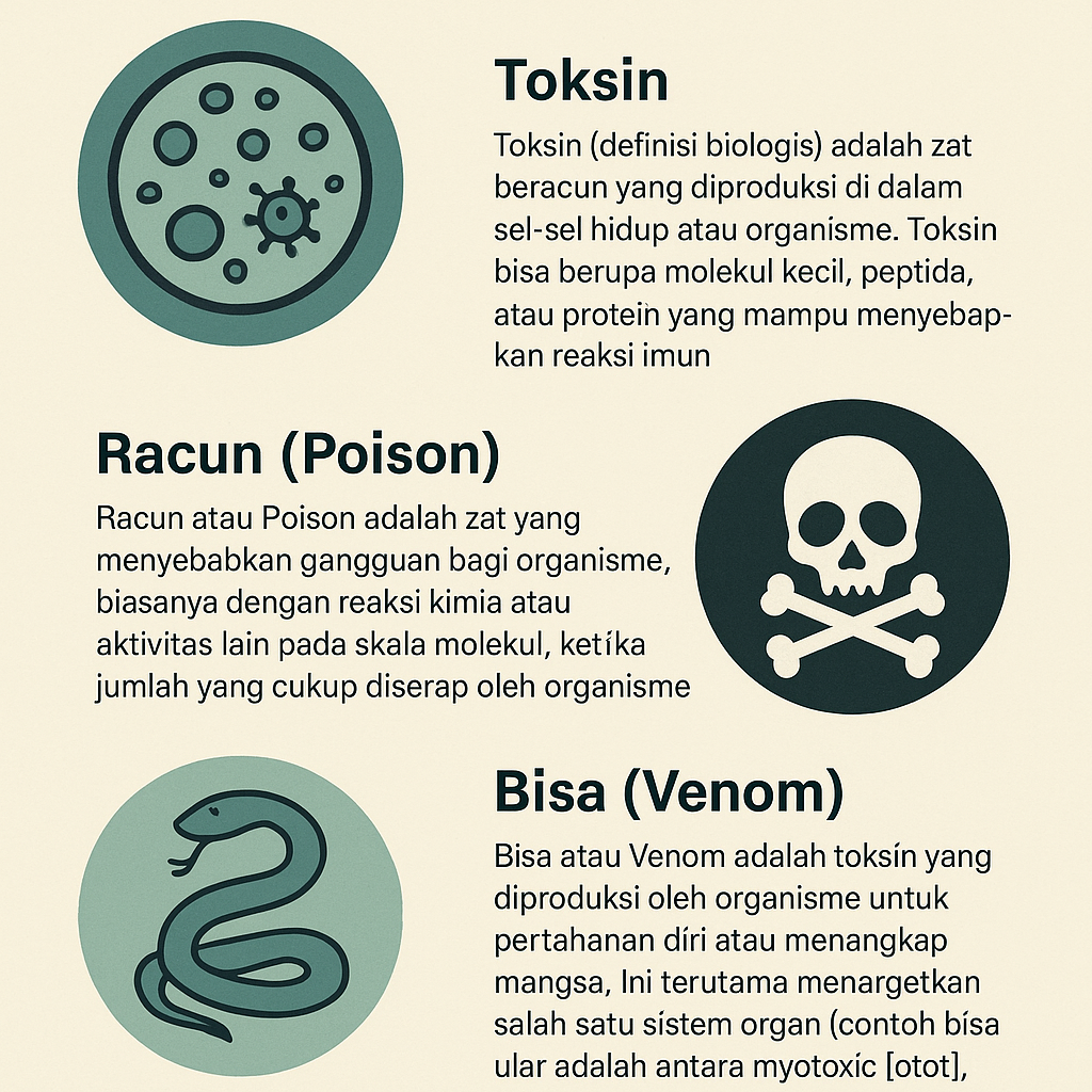 Kata “racun” mungkin sudah tidak asing lagi di telinga kita. Namun, tahukah Anda bahwa sebenarnya terdapat perbedaan antara toksin, racun (poison), dan bisa (venom)? Tiga istilah ini sering kali digunakan secara bergantian, padahal masing-masing memiliki definisi dan konteks penggunaan yang berbeda. Mari kita bahas satu per satu.